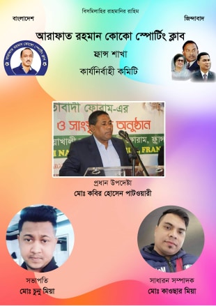 আরাফাত রহমান কোকো স্পোর্টিং ক্লাব ফ্রান্স এর সমন্বয়কারী এম আলী চৌধুরীর সমন্বয়ে ৩১ সদস্য বিশিষ্ট কার্যকরি কমিটি ও ১১ সদস্য বিশিষ্ট উপদেষ্টা কমিটির অনুমোদন করা হয়। সম্মিলিত প্রচেষ্টায় কার্যক্রম আরো বেগবান করার লক্ষে সাবাইকে ঐক্যবদ্ধ থাকার আহ্বান জানান নবগঠিত কমিটির নেতৃবৃন্দ।