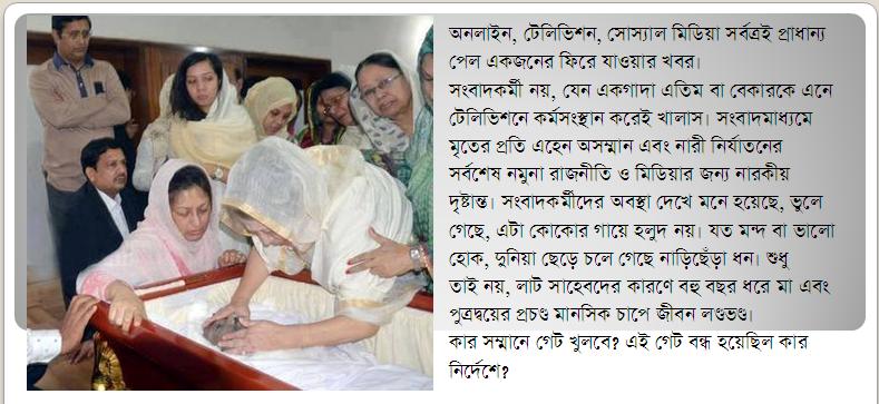 মৃত কিংবা জীবিত, কাকে ছাড় দিলো আওয়ামী লীগ? এটা শিকাগোর জিয়াউর রহমান ওয়ে নয় যে, বানচাল করতে ঢাকা-ওয়াশিংটন তুলকালাম বাধাতে হবে। পুত্রশোক যার হয়, একমাত্র সেই বোঝে, কোন দুঃসহ যন্ত্রণা থেকে এসব করতে হলো। ইনজেকশন দিয়ে ঘুম পাড়ানো কেন, যদি অজ্ঞান করার ওষুধও প্রয়োগ করতে হতো, একজন পুত্রশোকী মা হিসেবে বলতে বাধ্য হচ্ছি, ওই দিন কে লাট সাহেব কে নয়, হিসাব-নিকাশ বৃথা বরং কেউ তার জীবনকে নরক করে ছাড়লে, তার প্রতি তীব্র ঘৃণা দেখানোই স্বাভাবিক। সংসদে এবং বাইরে, জিয়া পরিবারের বিরুদ্ধে এমন কোনো নোংরা শব্দ অভিধানে বাকি নেই, যা ব্যবহার করেনি লীগ।