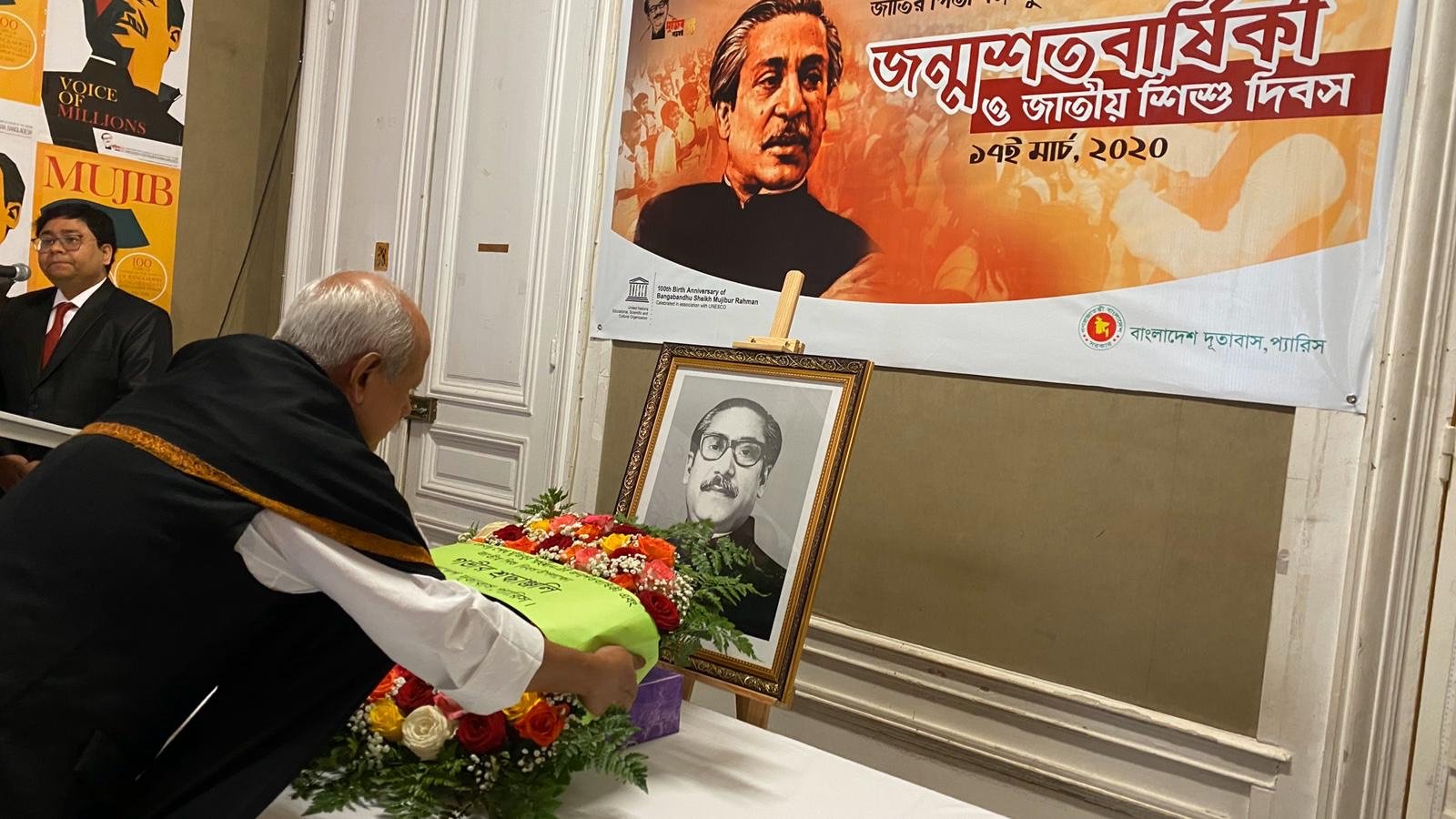 যথাযথ মর্যাদা এবং শ্রদ্ধা ও ভালোবাসার মধ্য দিয়ে বাংলাদেশ দূতাবাস, প্যারিস আজ ১৭ মার্চ জাতির পিতা বঙ্গবন্ধু শেখ মুজিবুর রহমান -এর জন্মশতবার্ষিকী এবং জাতীয় শিশু দিবস ২০২০ উদযাপন করে। অনুষ্ঠানের শুরুতে মান্যবর রাষ্ট্রদূত কাজী ইমতিয়াজ হোসেন দূতাবাসের সকল কর্মকর্তা- কর্মচারীর উপস্থিতিতে জাতীয় পতাকা উত্তোলন করেন। এরপর তিনি জাতির পিতার প্রতিকৃতিতে ফুলেল শ্রদ্ধাঞ্জলি অর্পণ করেন। এরপর পবিত্র কুরআন ও অন্যান্য ধর্মীয় গ্রন্থ থেকে পাঠ করা হয় এবং বঙ্গবন্ধু ও তাঁর পরিবারের সদস্যের রুহের মাগফেরাত কামনা করে মোনাজাত ও বিশেষ প্রার্থনা করা হয়। এছাড়া, দিবসটি উপলক্ষ্যে মহামান্য রাষ্ট্রপতি, মাননীয় প্রধানমন্ত্রী , মাননীয় পররাষ্ট্রমন্ত্রী ও মাননীয় পররাষ্ট্র প্রতিমন্ত্রী প্রদত্ত বাণী পাঠ করা হয়।